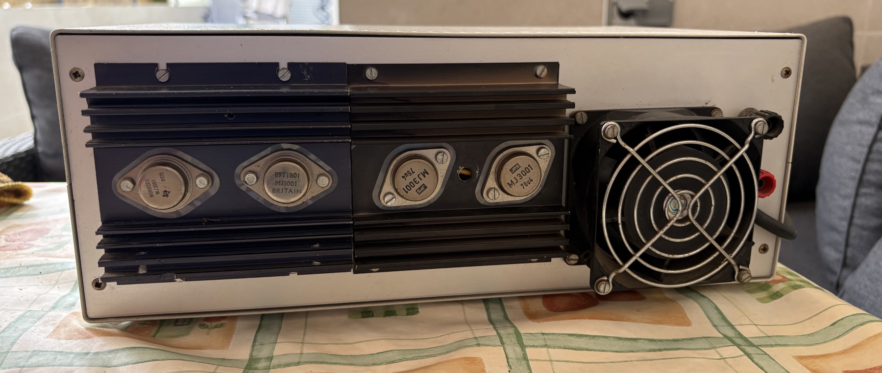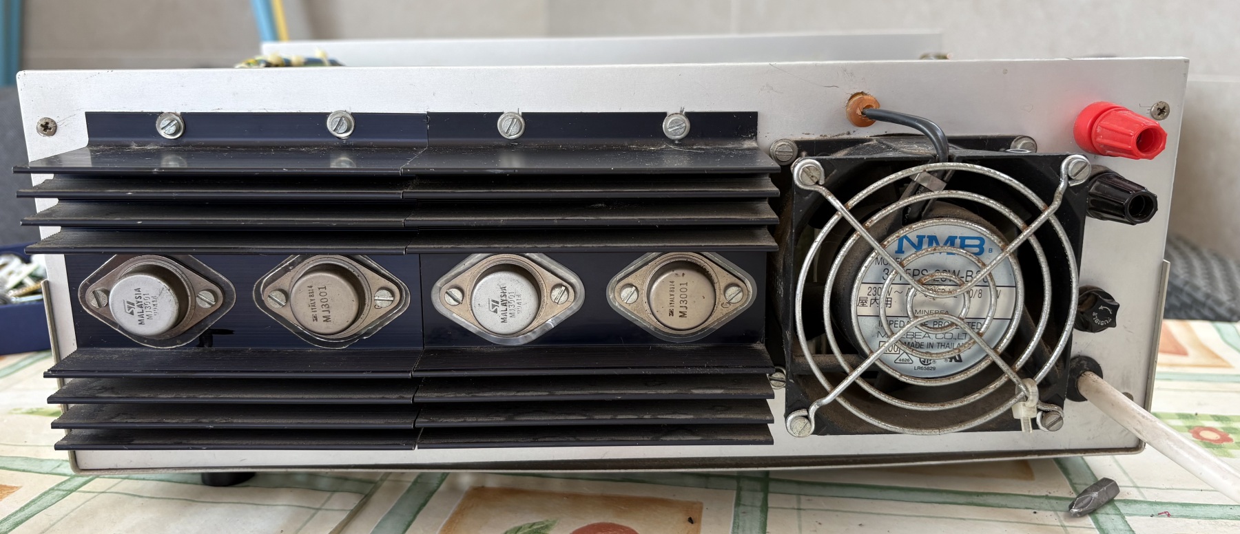 No tenemos las características técnicas. Se puede regular la tension y la intensidad de salida. Para la regulación de la tensión utiliza cuatro transistores MJ3001